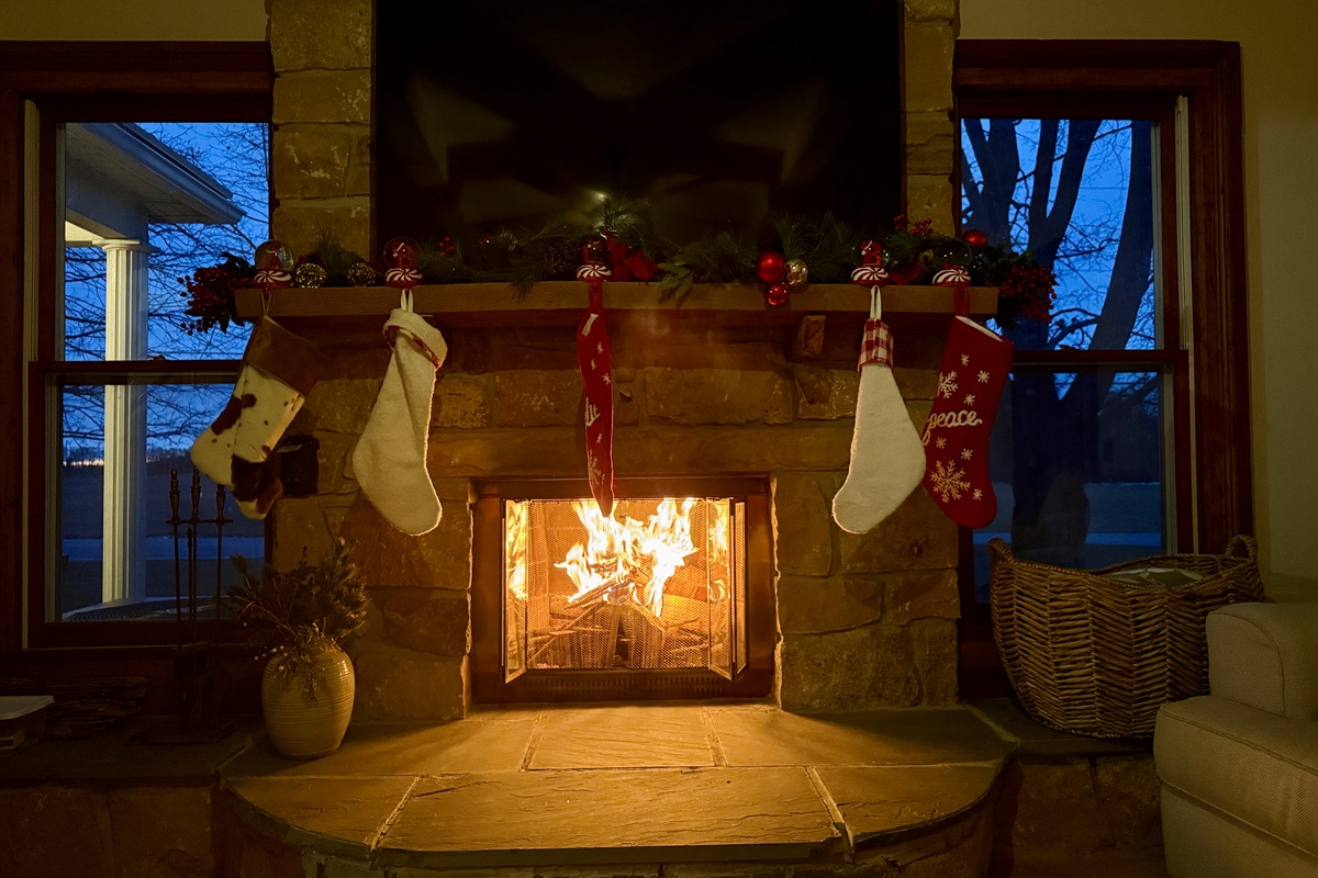 PARLOR / LIVING ROOM - Outside the kitchen is a combined living room, the parlor and living room. The parlor contains the beautiful main staircase and multiple places to lounge including a bay window. The living room contains multiple couches and a large Smart TV above a wood-burning fireplace.